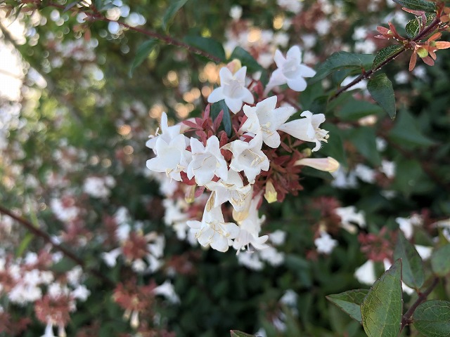 これはアベリアです。白い星形の花が集まって可愛いらしく咲いています。