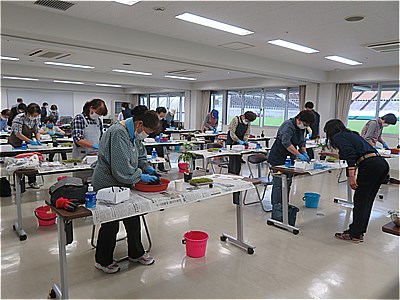 第10回目となる緑化講習会in信州スカイパークが総合球技場サンプロアルウィンにて開催されました。新型コロナウイルス対策として密にならないよう十分な間隔を開けて行われました。今回、皆様に作っていただいた苔玉は、『ガジュマル』・『パキラ』・『ペペロミア』の中からお好きな植物1つを選んでいただき行いました。皆様、手際よく作っていました。どれも力作ぞろいでした。大切にしたいとのお話もいただきました。皆様、ありがとうございます。本日も雨降りでしたが、最近は降水量の多い長雨となっています。急な天候の崩れや、予想の難しい天候の変化があるようです。気象情報に注意して行動して頂けたらと思います。また、新型コロナウイルス対策を行いながら、施設も再開されています。これからも気を緩めることなく、確りと新型コロナウイルスの感染予防対策を行い熱中症や天候にも注意し、公園で元気になって頂けたらと思います。