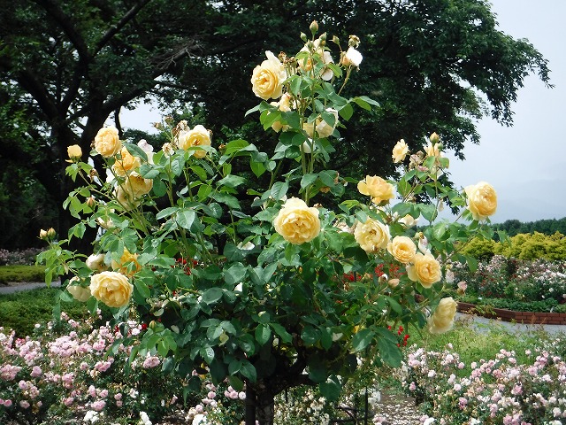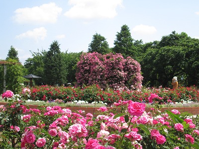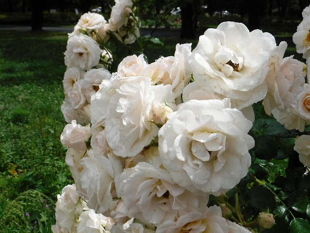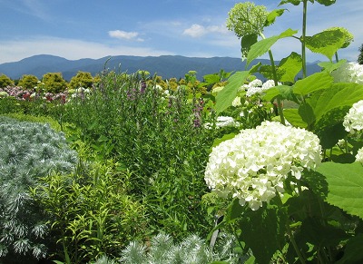 梅雨の晴れ間となった本日、スカイパークは朝から気温が高く日差しの強い一日となりました。そんな中、本日もバラ園は多くの方々で賑わっていました。 そして現在、バラ園近くの園路沿い半円花壇では「アジサイ・アナベル」が白く色付き始めています。 厳しい暑さの中、真っ白なアナベルがどこか涼しげな気持ちにさせてくれました(^ ^*)Karin