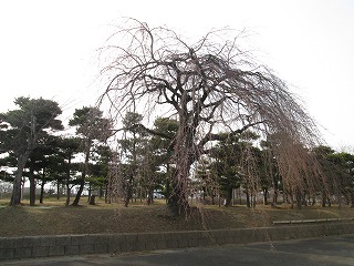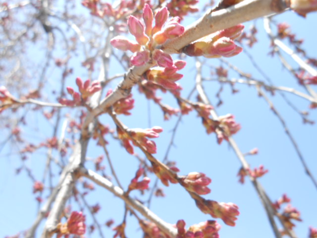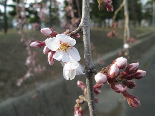 そんな中、陸上競技場西側園路沿いにあるシダレザクラが開花しました。