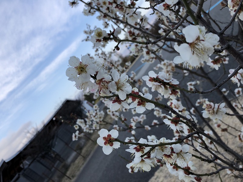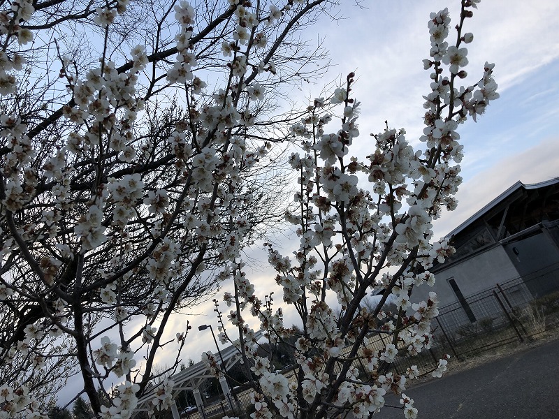 こちらは花木広場の梅です。夕方に撮影したので少し見にくいのですが、ほんのりピンクの白く美しい姿を見せてくれています。