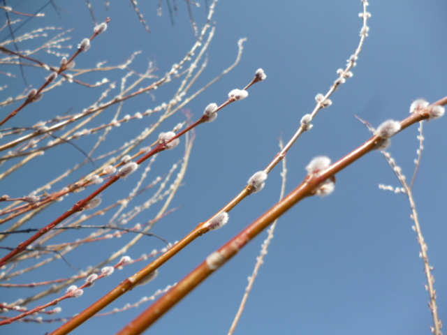 春に先駆けて大空にむかいのびやかに銀色の毛でおおわれた猫柳。