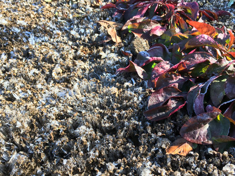 正午近くでしたが、日陰にはまだ白い霜柱が残っていました。